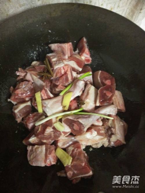锅中油烧热倒入鸭块,加上葱姜蒜八角桂皮一起翻炒。