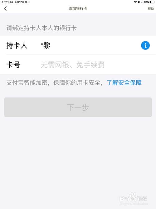 确认持卡人的姓名,同时输入自己的卡号,点击下一步,进行密码修改。
