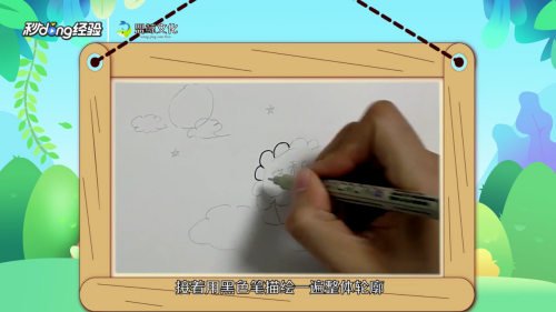可以画一些月亮、云朵之类的装饰,用黑色笔描绘一遍整体轮廓。