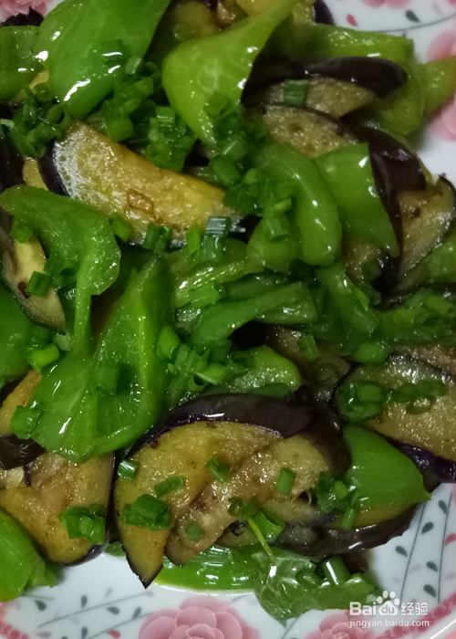 茄片炒软了,加花椒面、五香面、味精调味,就出锅装盘了,撒上葱花。简单做青椒炒茄片就做好了。