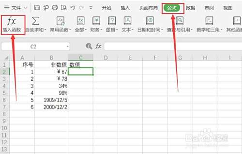然后,鼠标选中数值列下方第一个单元格,点击菜单栏中的“公式”,按鼠标左键单击“插入函数”,如图所示