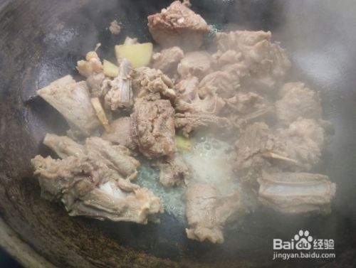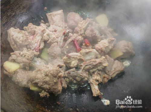 锅里放入羊排和生姜炒香。