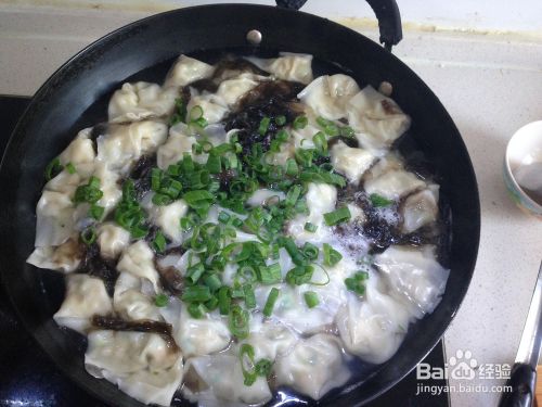 好了,成品出来了,锅中加水,待水烧滚后锅中加一勺盐,在把馄饨下入锅中,全部飘起来后,放入准备好的紫菜,出锅前撒点小葱花,不喜欢可以不撒(由于馅中放虾米了,所以锅中不在放虾米)