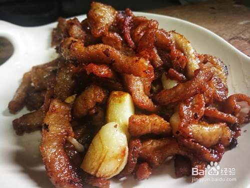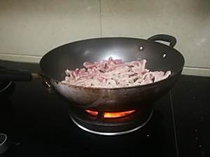加入大蒜煸香。在猪颈肉没有充分出油前请不要加酱料,因为容易焦