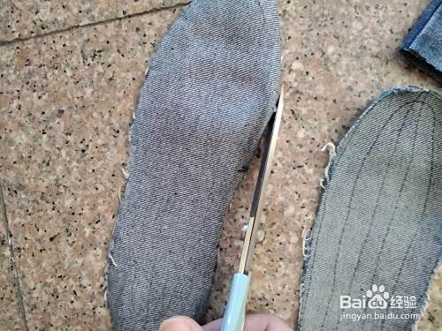剩余下来的脚腿裤也不要扔掉,我们可以把它裁剪成自己鞋垫大小的形状。鞋垫的厚度为2~3片的布。