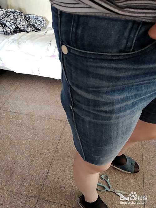 在自己的牛仔裤上面用划粉画出需要的长度。用剪刀剪除多余的部分。
