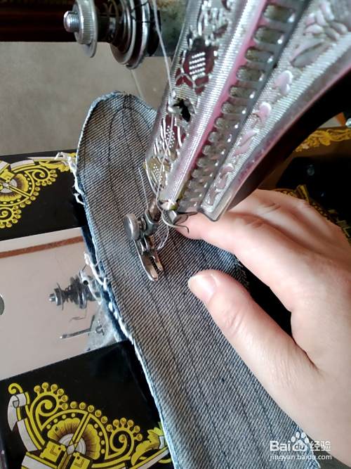 在缝纫机上把牛仔短裤的底边缝一道。使之光滑。