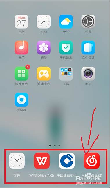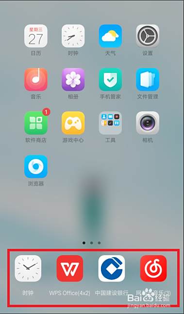 手机屏幕下方出现几个软件,表示已经进入“小工具”界面。
