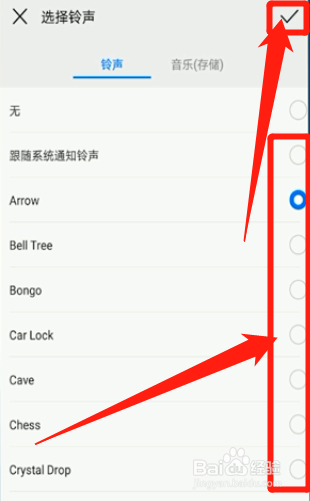 进入选择铃声界面后,选择想要的铃声并打开后面的开关,最后点击右上角“√”图标,即可保存选择的手机铃声,后续接收日历提醒时就会有铃声提醒。