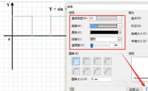 绘制完sin函数,单击鼠标右键,选择“格式”-“线条”按钮,设置曲线的粗细和颜色。