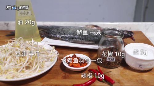1准备食材,鲈鱼一只,豆芽半斤,水煮鱼料包一包,油20g,辣椒10g,花椒10g,盐5g。