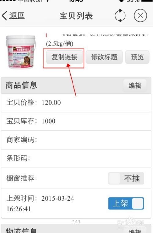 想要查找宝贝,可以在搜索框中输入宝贝名称,点击搜索,结果出来后,打开宝贝页面,点击“复制链接”,如图所示