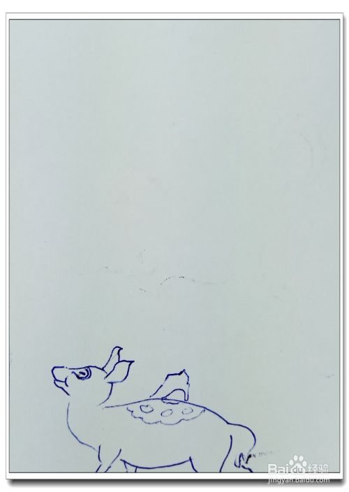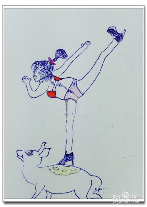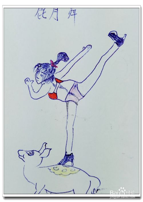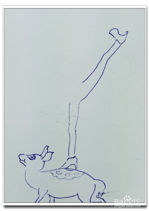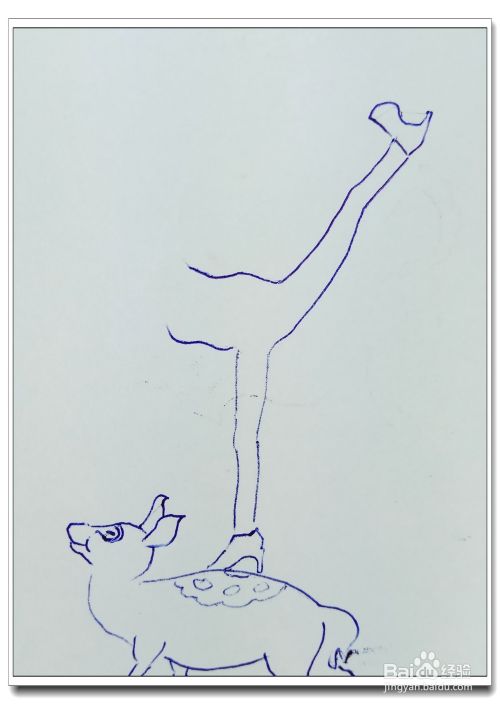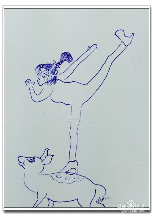 画出表演人的两条腿。她的一条腿高高的抬了起来,只用一条腿站在鹿背上。