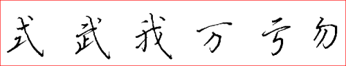 斜形独体爷迅侮字例,如式、武、我、万、亏、勿……