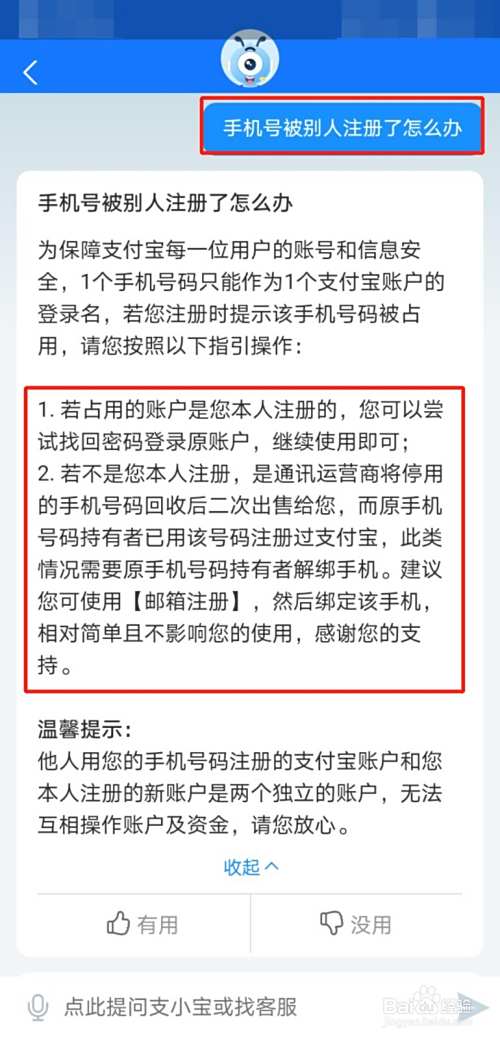 2.若不是您本人注册,是通讯运营商将停用的手机号码回收后二次出售给您,而原手机号码持有者已用该号码注册过支付宝,此类情况需要原手机号码持有者解绑手机。建议可使用【邮箱注册】,然后绑定该手机,相对简单且不影响您的使用。