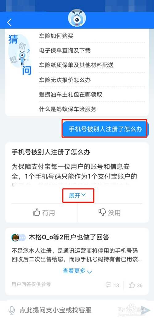在对话框中输入“手机号被别人注册了怎么办”,在回复的信息中选择“展开”。