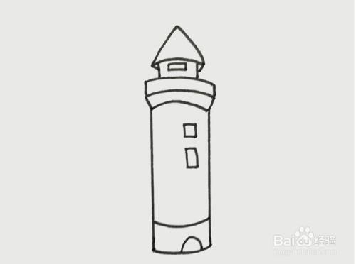 往上画出塔顶小房子的墙壁,在上面画出矩形的窗户,然后画出尖尖的塔顶。灯塔的外形就画出来了。