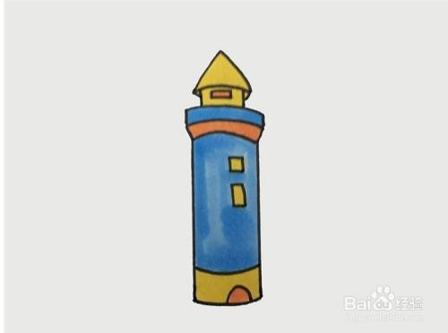 先画出一个圆柱,在上面画上门和两个窗户,上方画出小房子和尖尖的房顶,注意补充塔身的细节,并给塔身涂上蓝色,塔顶和底座涂黄色,简单的灯塔就好了。