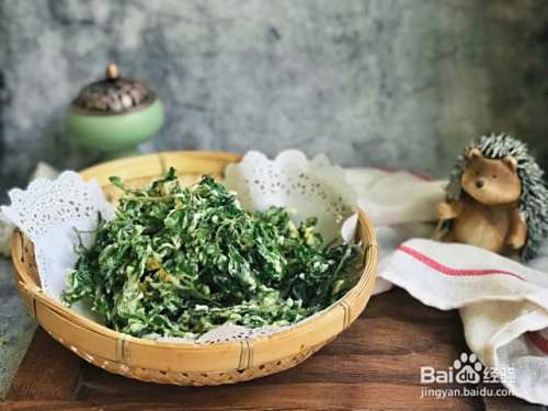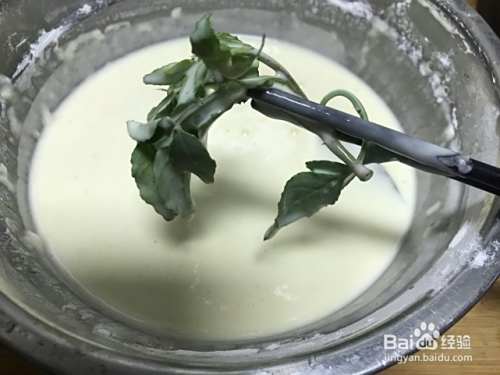 然后把清洗好的胡椒粉芽挂上面粉,不用裹得太厚,在裹好面糊之后还要捞出来静置一会,沥干多余的面糊