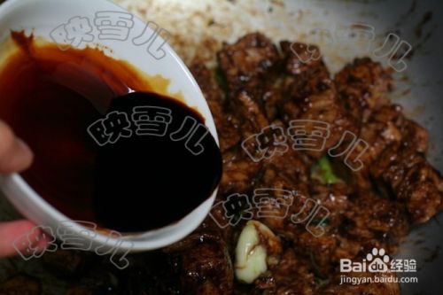 加入牛腩一起炒,再下酱油,米酒。加半碗水加盖焖10分钟。