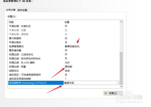 2.点击管理3D设置,按照图片上将电源,纹理质量设置为最近性能,将刷新率选择最高。