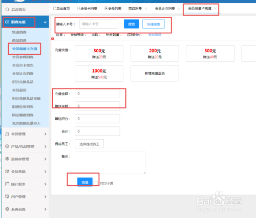 卡片充值,选择消费充值,选择会员储值卡充值。输入框内输入卡号,选择搜索。选择充值的金额,点击充值。