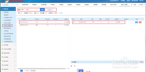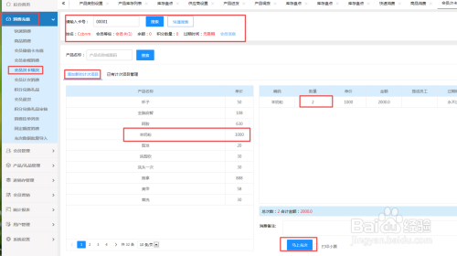 4现在进行商品消费。我们选择消费充值,选择商品消费。在输入框内输入卡号,搜索会员。选择对应的商品进行确定结算。