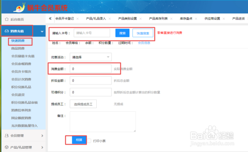 怎样进行普通的金额消费?我们选择消费充值,选择快速消费。输入卡号搜索会员。点击消费金额,点击结算即可。