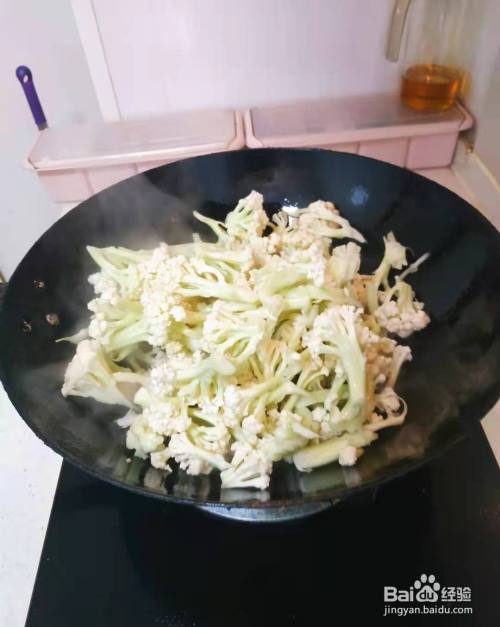 倒入菜花,翻炒,大概2-3分钟,放入十三香、盐,翻炒。然后,放入清水10克,稍微煮炖一下。