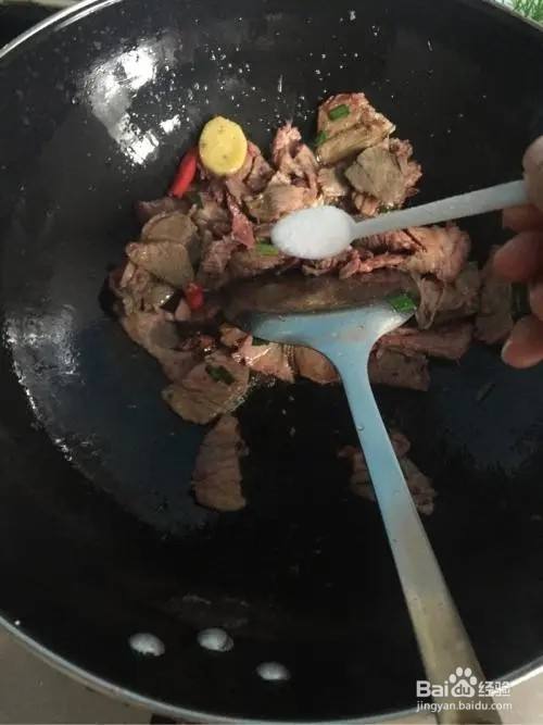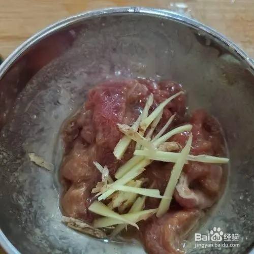 锅内倒入少许油,放入姜片煸香,放入腌制好的牛肉片翻炒至变色。