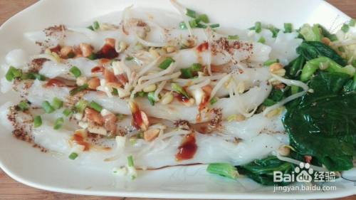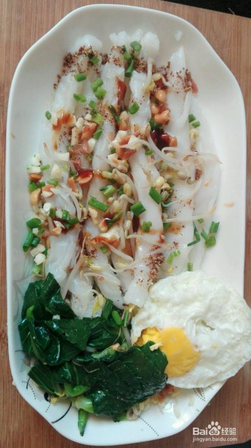 我是整条地铺在餐盘里,也可以像凉皮那样切片,撒上葱蒜花生末,蔬菜(我用开水烫菜,再进微波炉转一下),再淋上生抽、蚝油、醋。最后准备一点花椒粉和玉米油(进微波炉加热到冒泡),把花椒油淋在最上面,就可以了。