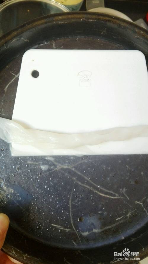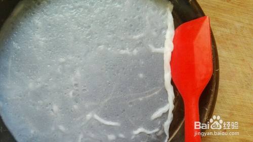 大火蒸两三分钟,面皮子呈许多气泡,就是熟了,调小火,戴只手套,取出盘子,用塑料刮刀沿着一边慢慢拨开。