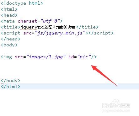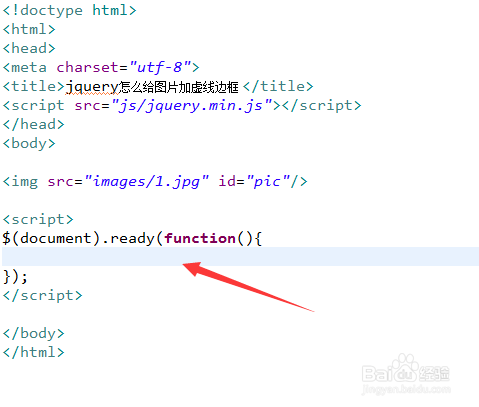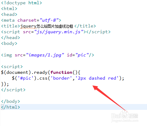 3、在function方法内,通过id获得img对象,使用css()方法设置border属性值为"2px dashed red",即给图片添加2px宽的红色虚线边框。