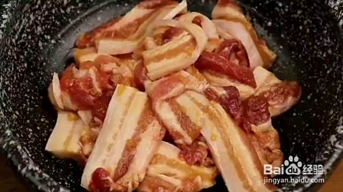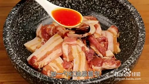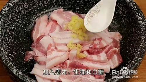 我们将五花肉洗净控干水分切成片,装入碗中加入姜末,生抽,白糖,高度白酒,抓拌均匀腌制半小时