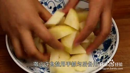 接着将糯米倒入绞肉机中搅打成粉,不要太细,粗一点口感更好,接着将土豆削皮切块,加入适量的盐抓拌均匀铺在盘底备用