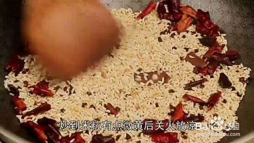 接着在无水无油的锅中放入糯米,桂皮,八角,盐,干辣椒,花椒,小火翻炒出香味,炒至糯米表面发黄即可关火