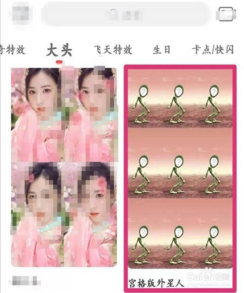 打开逗拍,点击下方的大头,然后在有关大头的相关模板,找到宫格板外星人模板,点击进入。