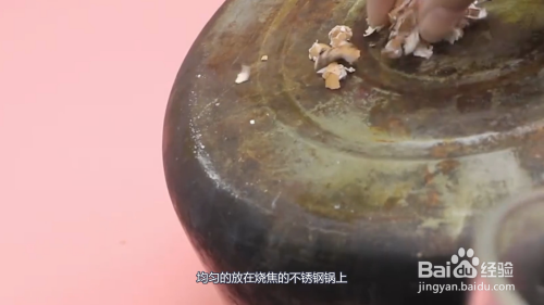 将一个空的鸡蛋壳捏碎后,均匀的放在烧焦的不锈钢锅上。