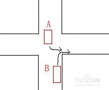 右转弯让左转弯车先行,下图中B车右转弯,要让左转弯A车先行