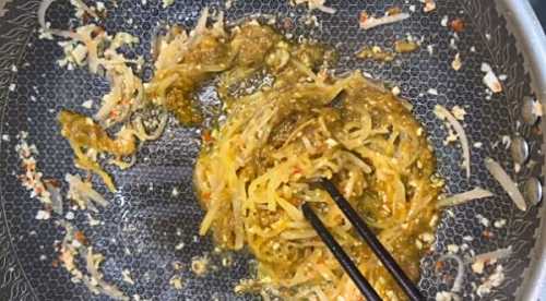 加入准备的酸萝卜丝,蒜末,泡椒末炒香