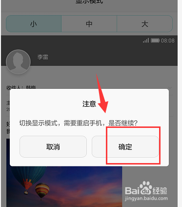 然后单击应用按钮,确定重启,这样重启后显示模式就变小了。