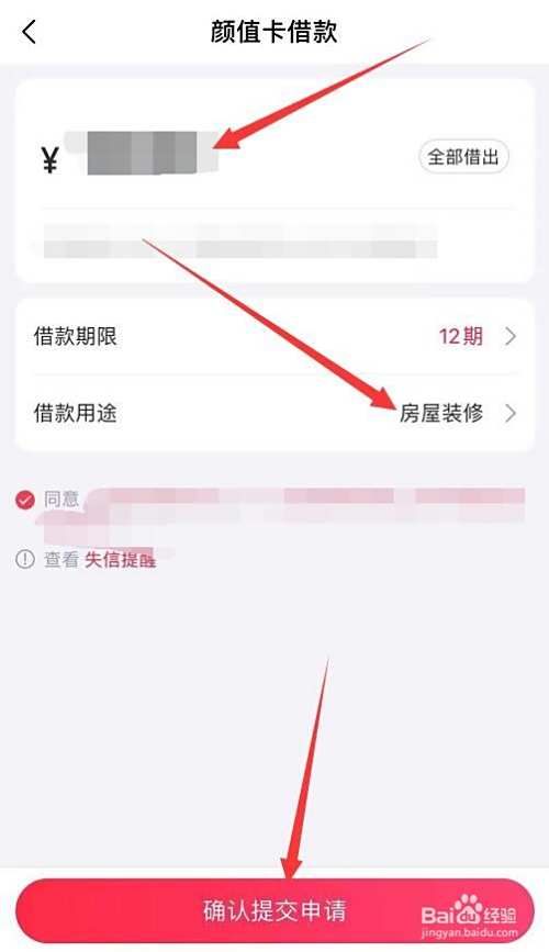 输入金额和借款用途,勾选同意书后,点击【确认提交申请】。