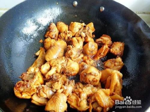 热锅凉油,油热6成,下白糖炒成咖啡色,下鸡块翻炒均匀上色,炒到鸡块出香味,加料酒翻炒均匀