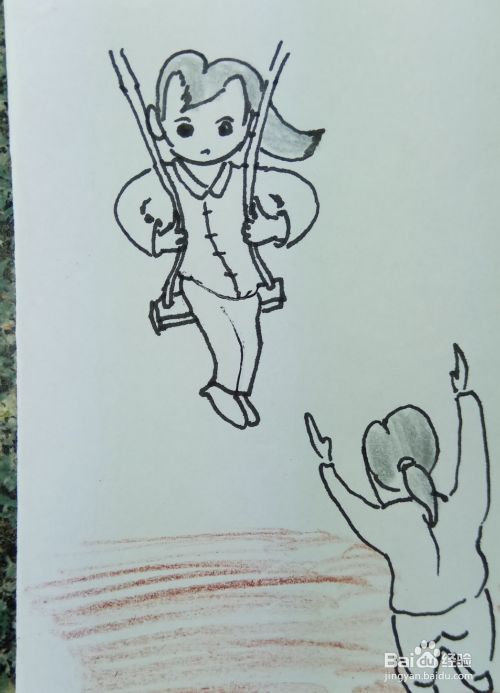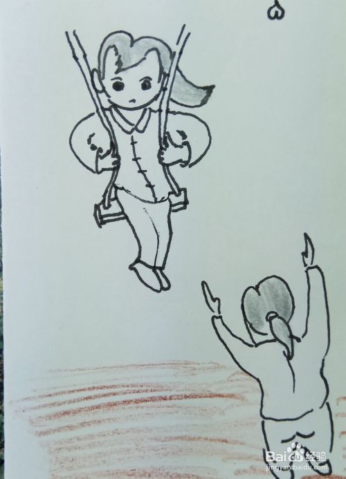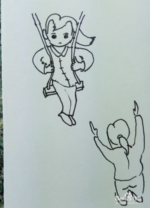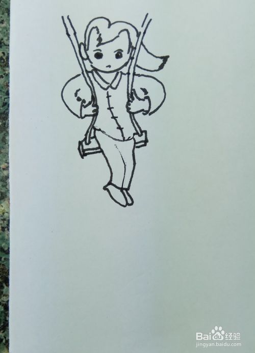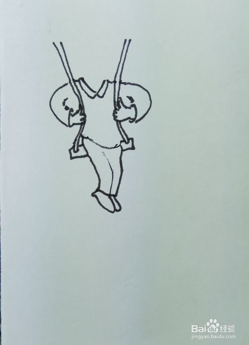 再用线条和曲线画出她的上半身部分,并画出她身上穿着的衣服,她的两只手紧紧的抓着秋千两边的绳子。
