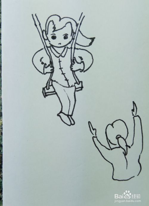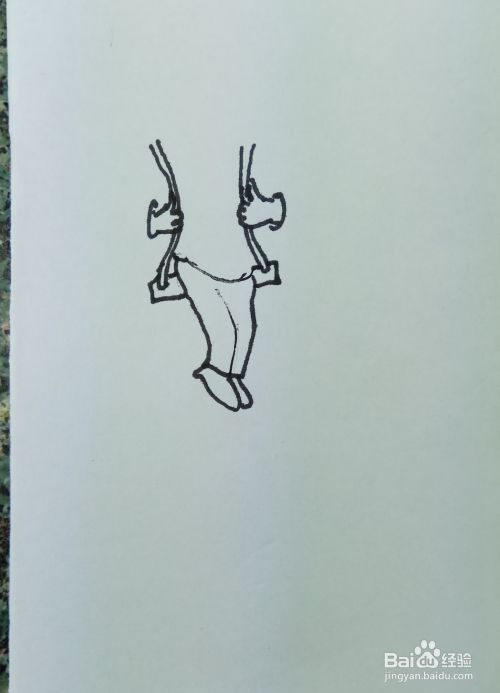 在白纸上用线条和曲线画出一个小孩的身体,并画她的两只手,画出她的腿和脚,她正在一个秋千上坐着。