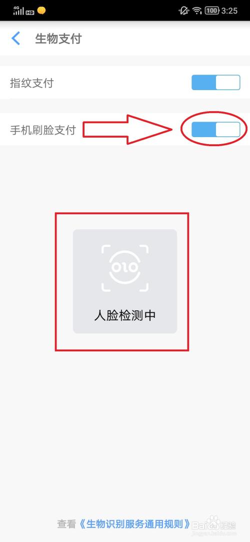 5在生物支付中点击打开“手机刷脸支付”选项的开关,等待人脸检测完成即可。  END END