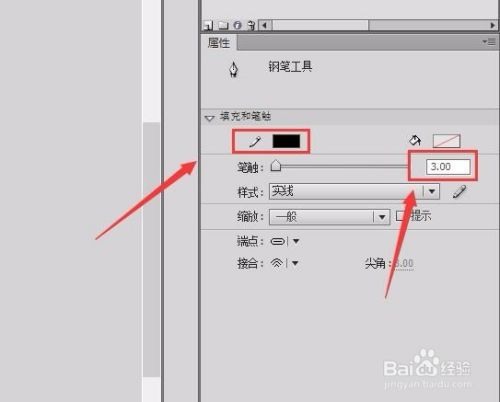 在工具箱内找到钢笔工具,在属性里设置笔触颜色为黑色,笔触大小为3,如图所示: