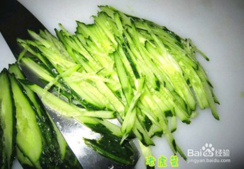 首先,尖椒、黄瓜、葱洗净,切成丝