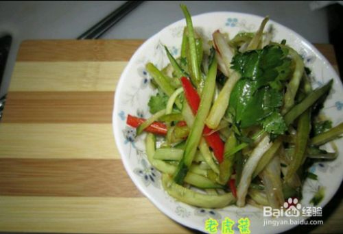 在处理好蔬菜,要放进拌盆的时候,可以先加入尖椒、黄瓜腌2分钟后,再加入葱丝、香菜拌匀即可。