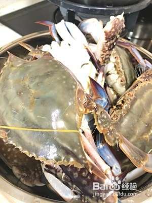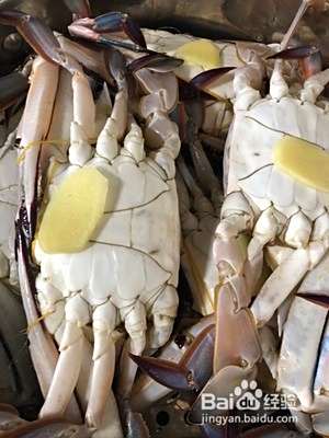 蒸锅水开上汽后,放入螃蟹,再添几个姜片。螃蟹要肚脐向上,这样蒸的时候汁水会留在壳里。